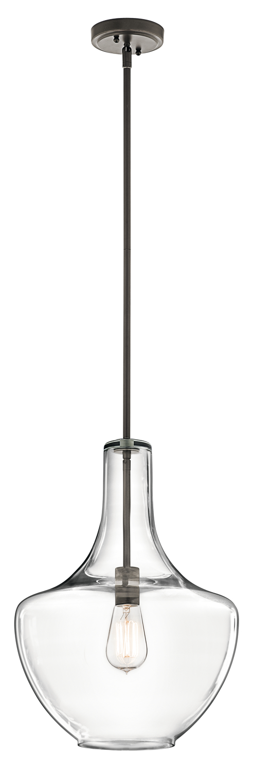 The Everly 19.75” one light bell shaped pendant comes with a curved, glass blown container featuring clear glass and an Olde Bronze® finish for a simple and elegant look. The Everly's versatile design coordinates with a variety of styles and can be used singularly, in multiples or arranged at varying heights to elevate the room.